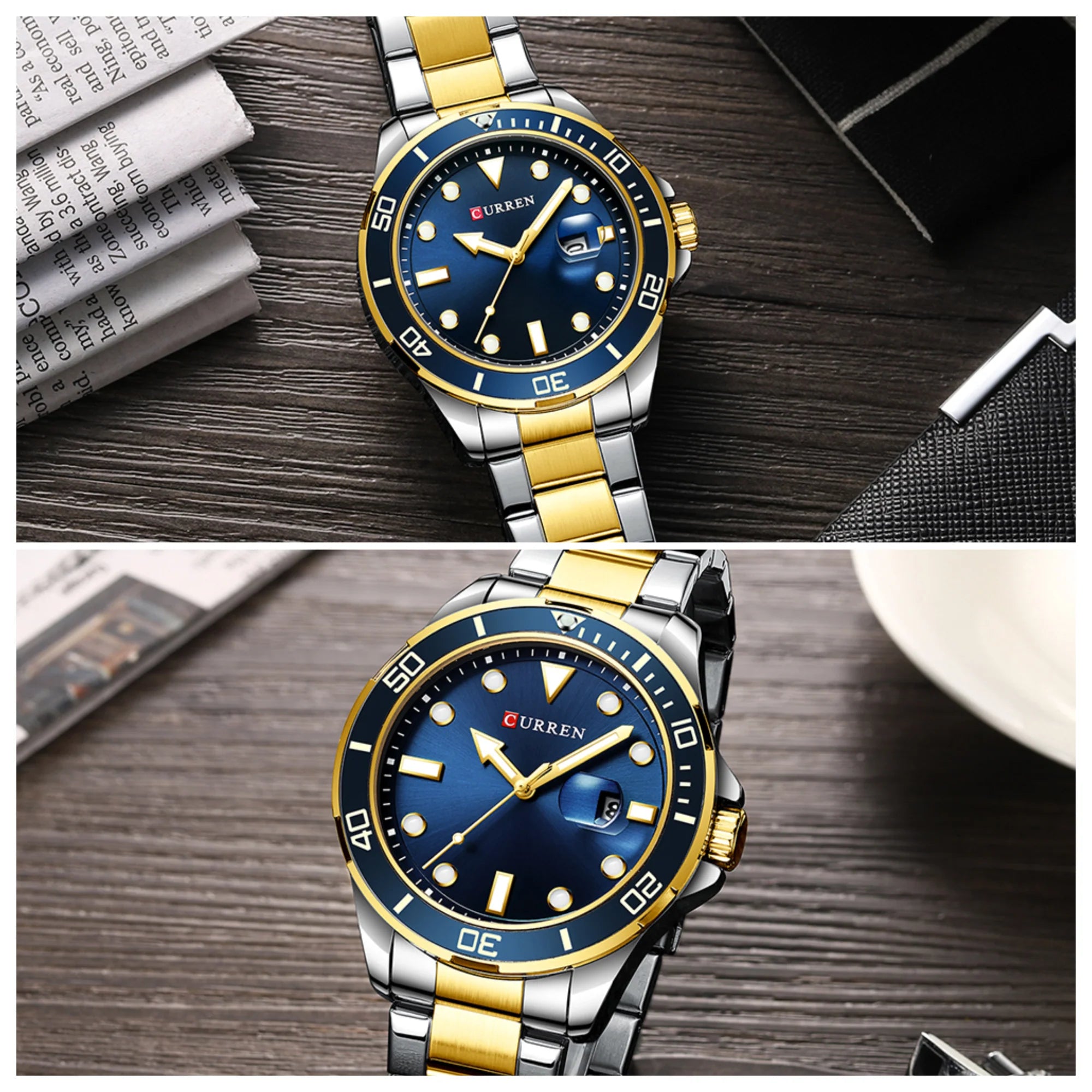 Reloj CURREN con un diseño en tonos plateados, dorado y azul los vuelve la mejor opción para usarlo en reuniones de trabajos.